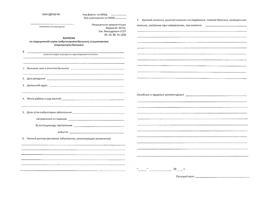 Серьёзное заболевание или травма, требующие длительного лечения и реабилитации, неприятны не только физическими страданиями и риском осложнений. Они неизбежно ведут к хлопотам по месту работы или учёбы. И если в средней школе на долгое отсутствие ученика по болезни педагоги смотрят сквозь пальцы, то уже в институте, а тем более на месте постоянного трудоустройства к вынужденному прогульщику приковано внимание администрации. С него почти наверняка будет истребована форма 027у – краткая выписка из истории болезни.